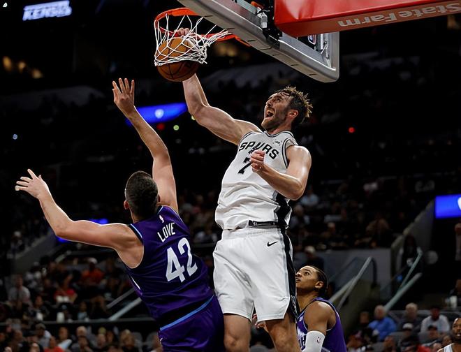 本场比赛中,马刺的内线新援卢克-科内特(Luke Kornet)的表现依然是保持在一个极高的水平。科内特全场出场18分16秒,投篮4中2,罚球4中3,得到了7分6篮板3助攻2盖帽的数据,还有1次失误和1次犯规,正负值更是达到了全队最高的+20。科内特在进攻端也是在对手内线制造了一定的威胁并且拿下了一些分数。不仅如此,他在传球和策应方面的能力也是依然非常可靠的。除此之外,科内特在防守端的表现同样是相当出色的,他在篮板保护、护框和内线防守方面的作用也是肉眼可见的。科内特的出场时间并不多,但是他也是将自己在攻防两端的才能都发挥了出来,他也是在球权和战术地位有限的情况下又一次证明了自己对于比赛的影响力。